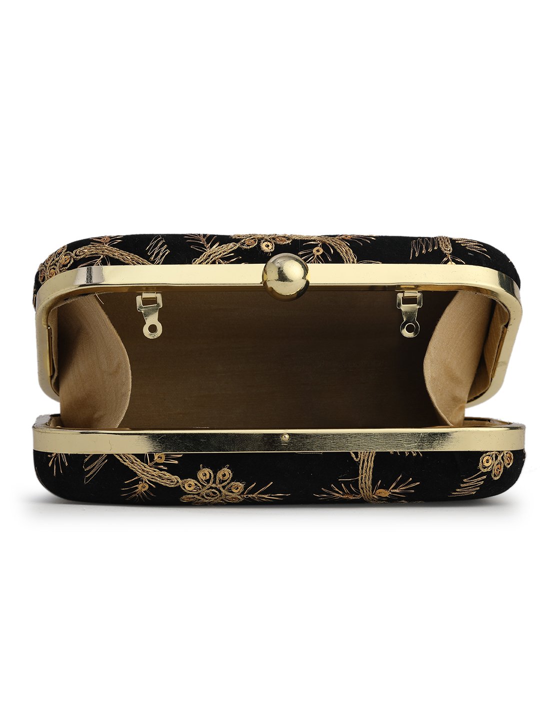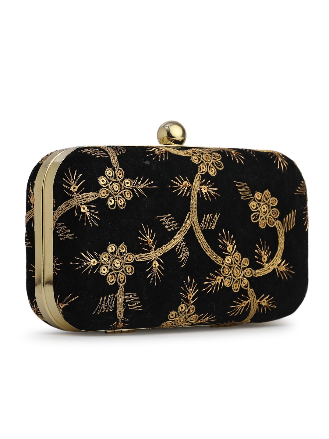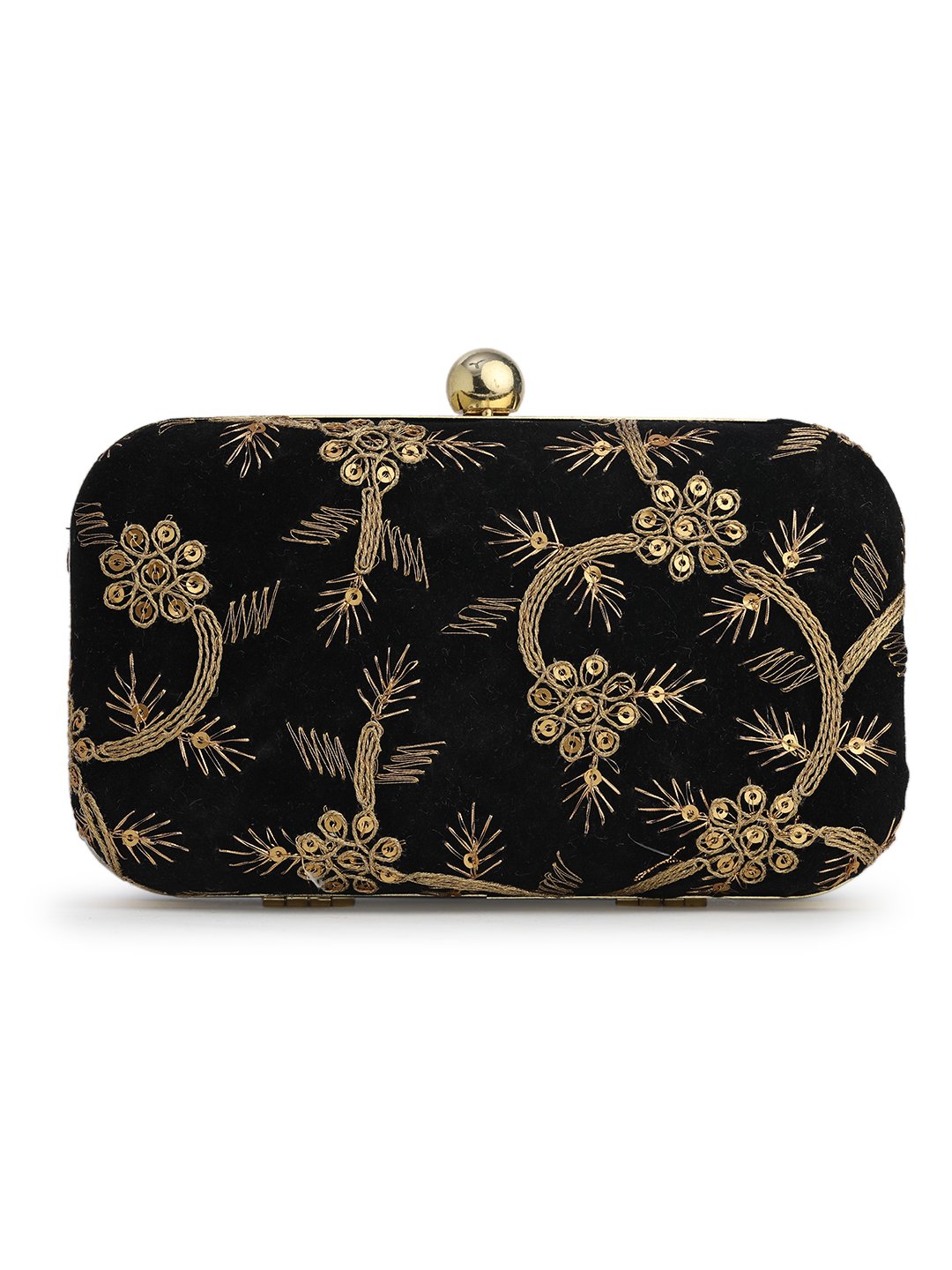Black & Gold Embroidered Box clutches, Has gold chain shoulder strap, 1 main compartment with twist closure
