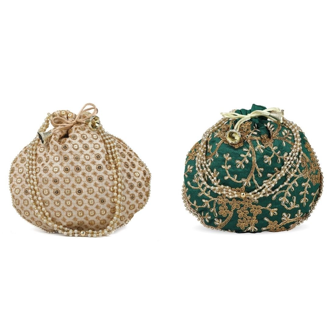 Combo – Designer Embroidered Potli Bag – Golden & Green