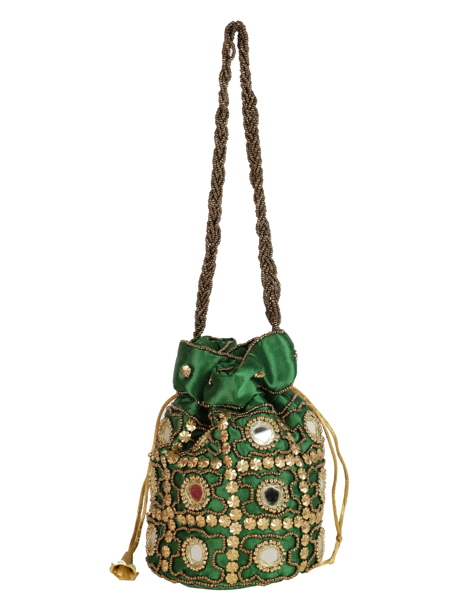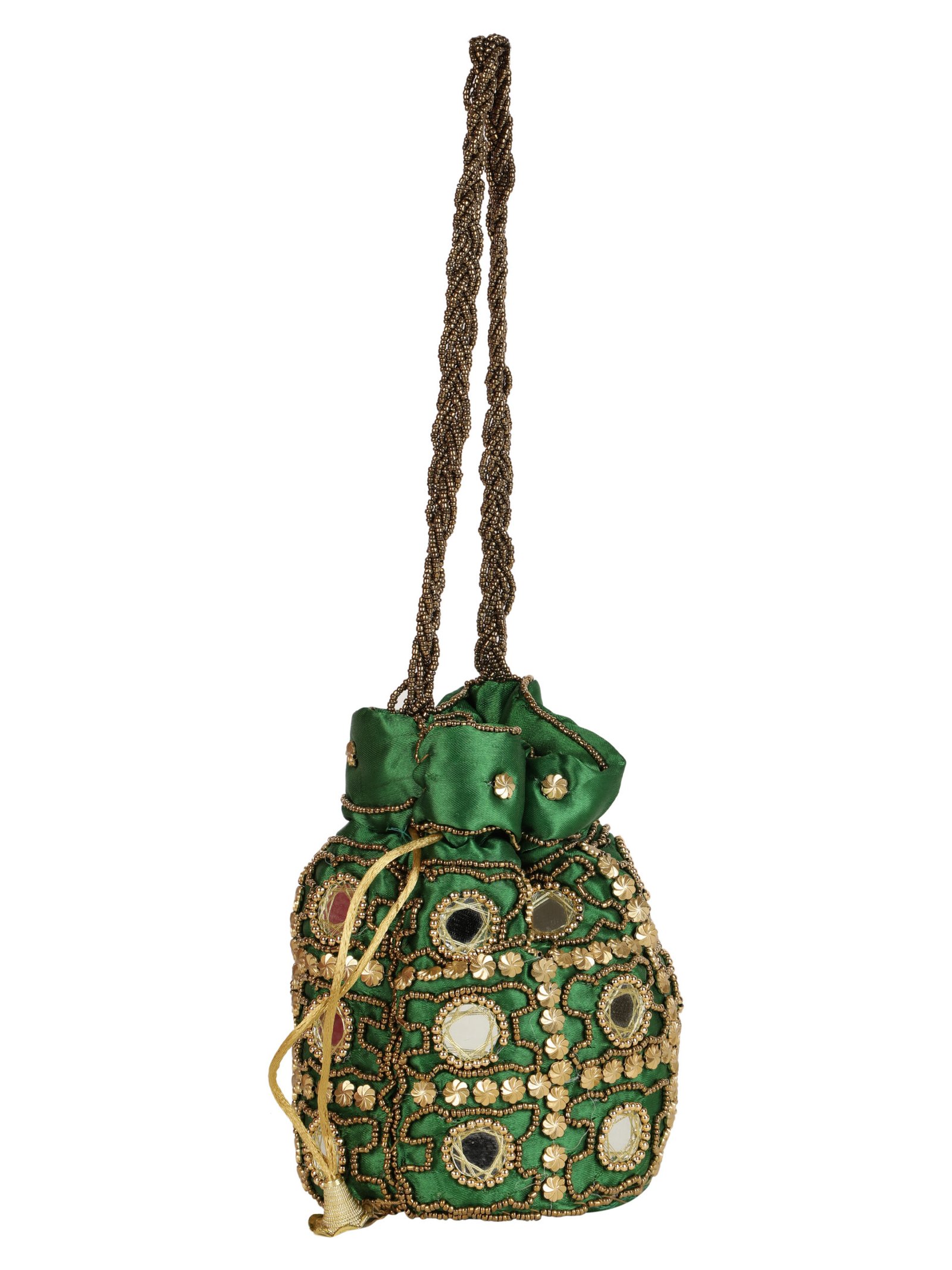 This product is a combo of tow Embellished potli bags having wrist loop 1 main compartment each with drawstring closure. Size & Fit Size of each potli bag : 9 x 9 x 3 Inch (Length x Width x Depth ) Material & Care Fabric Wipe with clean, dry cloth