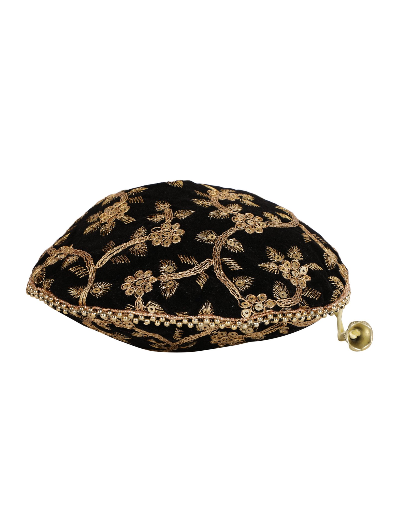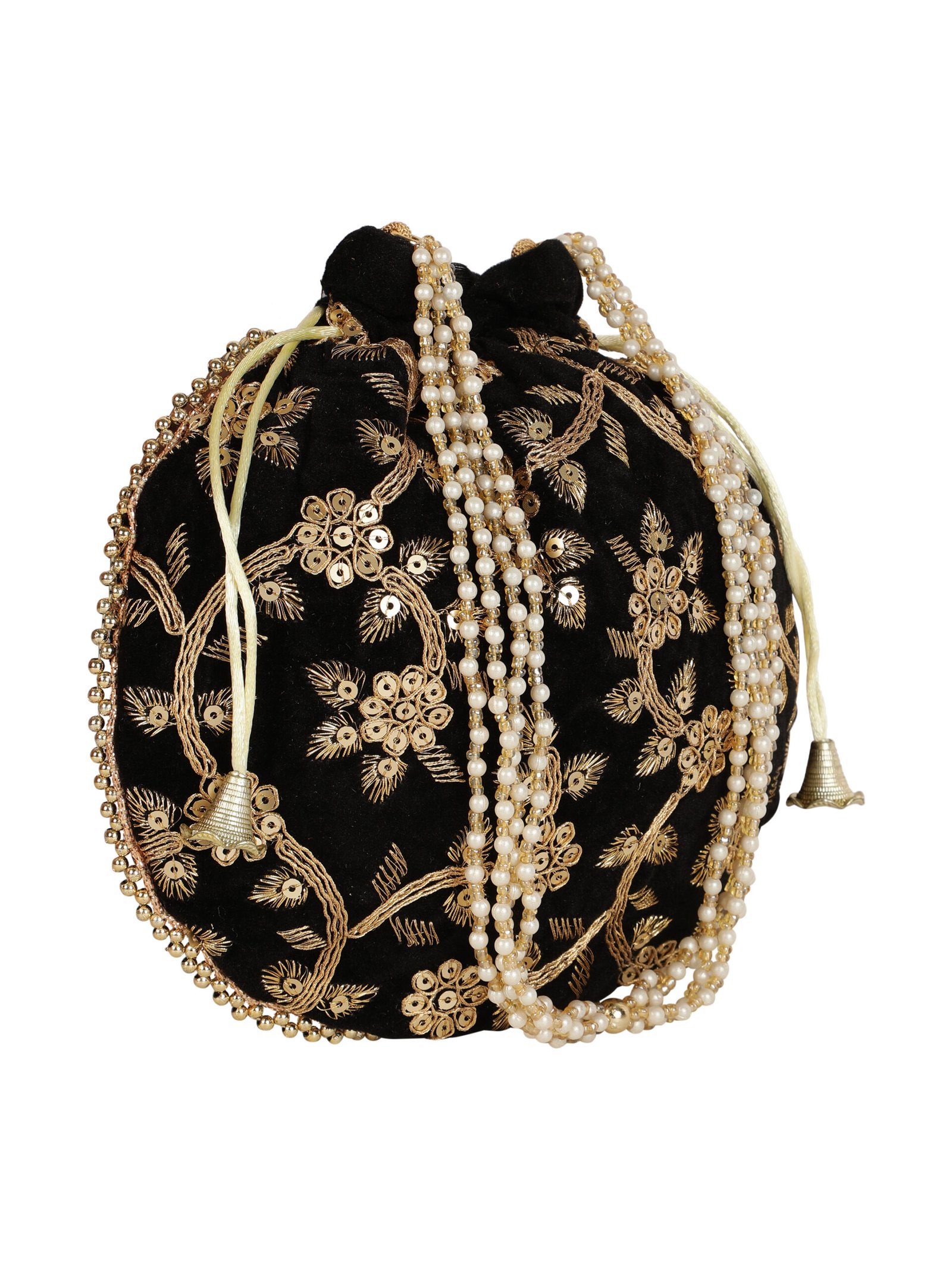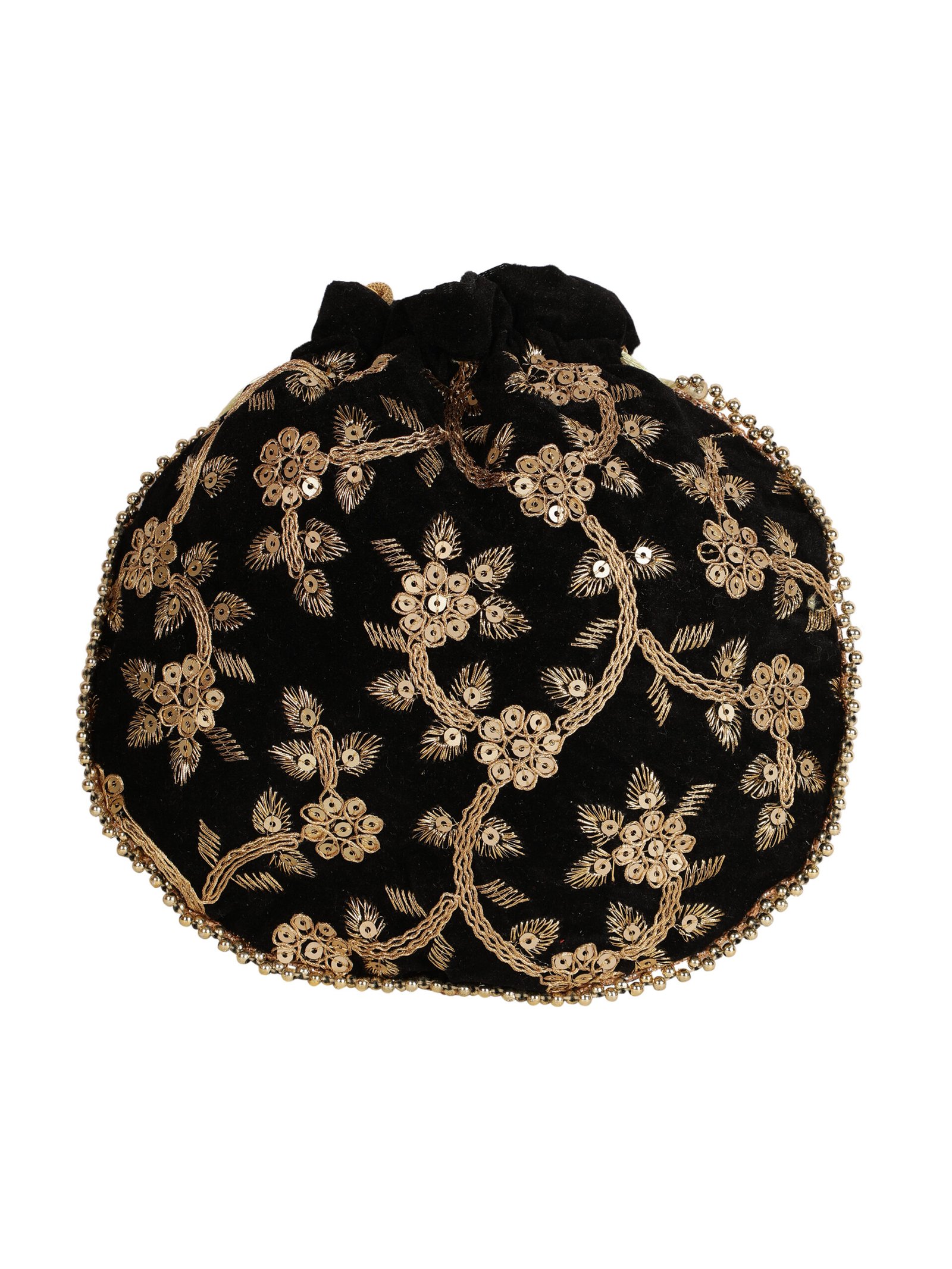 Black and gold-toned embroidered potli clutches Has wrist loop 1 main compartment with drawstring closure Size & Fit Height: Width: Depth: Material & Care Wipe with clean, dry cloth