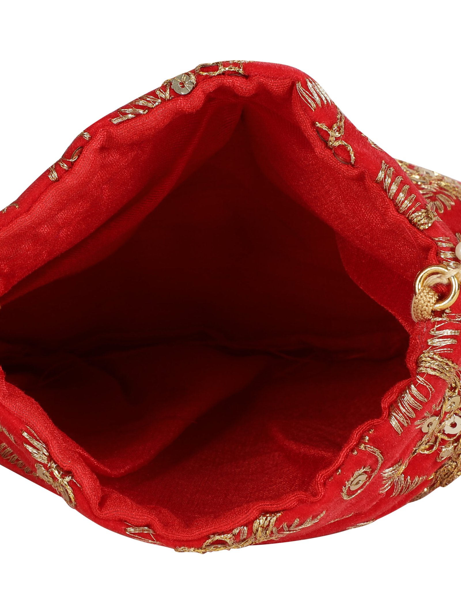Red Embroidered Potli With Wrist Loop Has wrist loop 1 main compartment with drawstring closure Size & Fit 18x2x10 cm Material & Care Fabric Wipe with clean, dry cloth