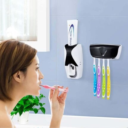 Toothbrush Holder with Cover Automatic Toothpaste Dispenser Set Dustproof with 3M Sticky Suction Pad Wall Mounted Kids Hands Toothpaste Squeezer for Washroom (Color May Vary, Plastic)