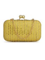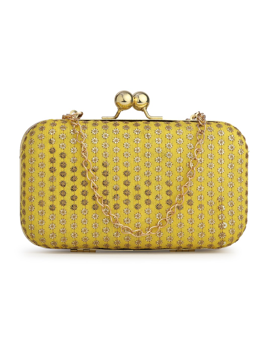 Yellow & Gold Embroidered Box clutches, Has gold chain shoulder strap, 1 main compartment with Kiss closure